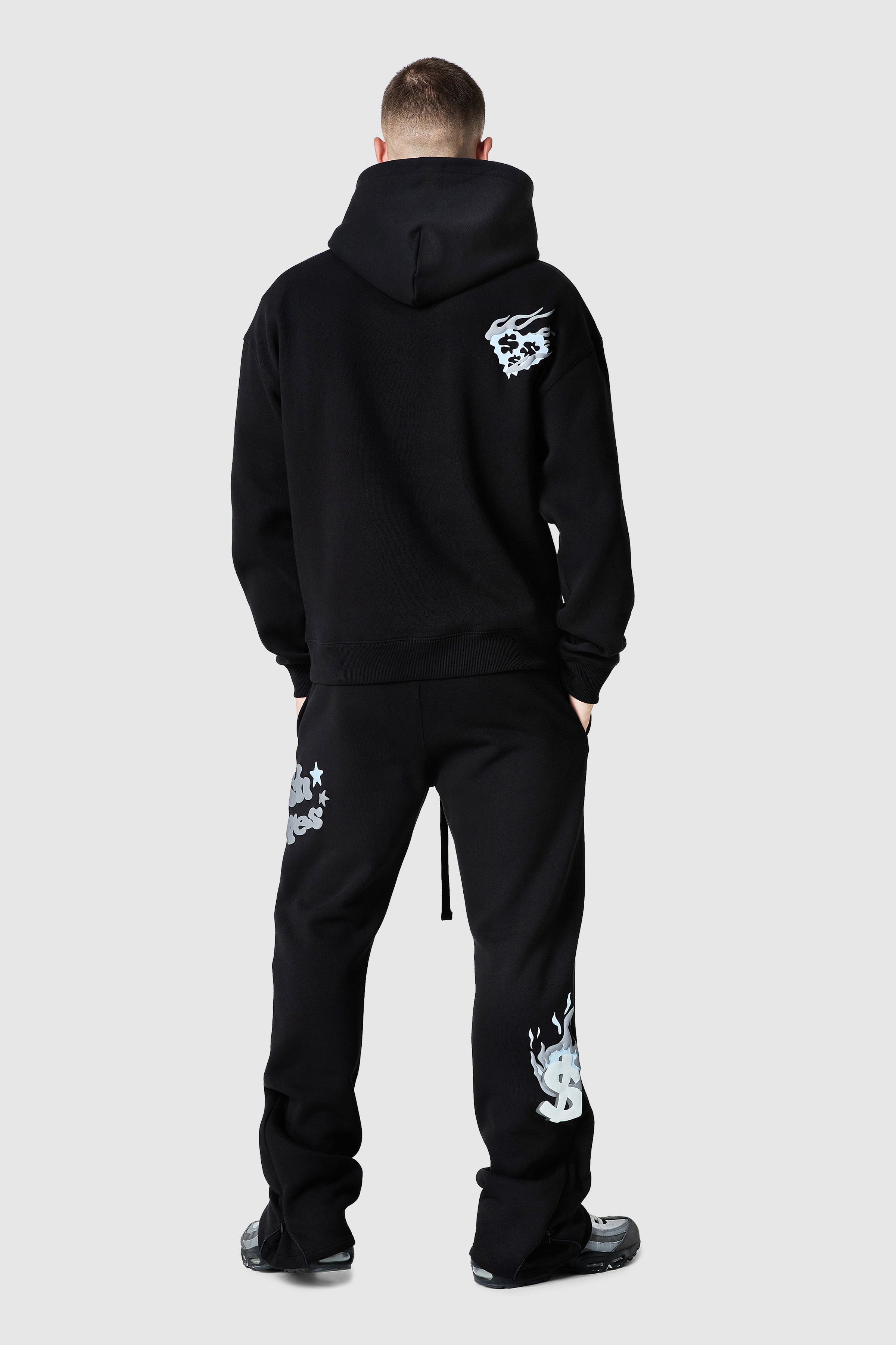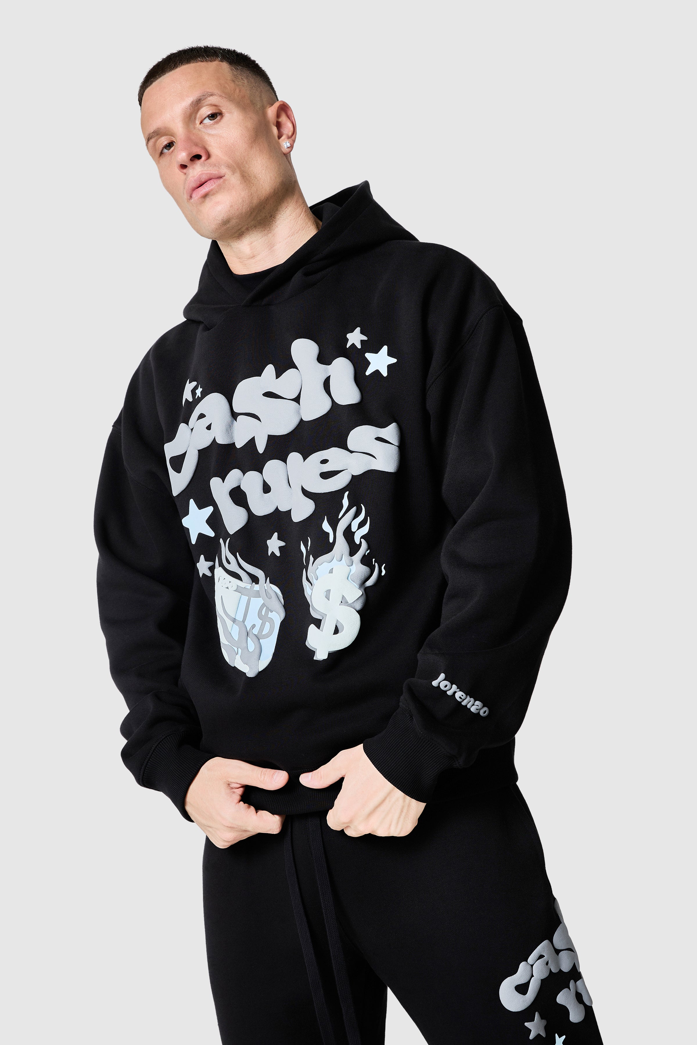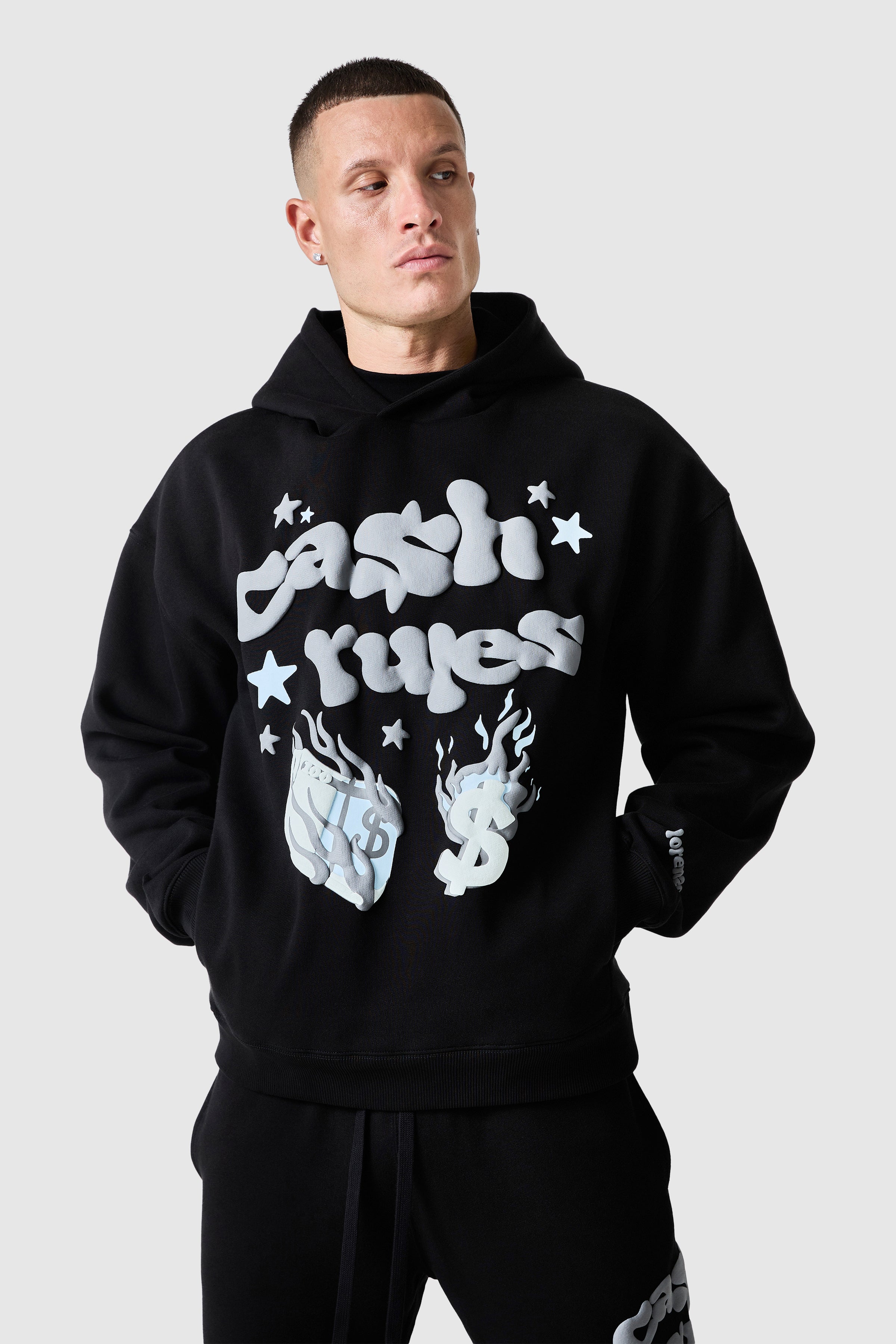 A relaxed hood silhouette built for everyday wear. The Cash Rules in Black features a puff print graphic with a classic kangaroo pocket for functionality and comfort. Pair with the matching Jogger and tee for a full head-to-toe statement look.