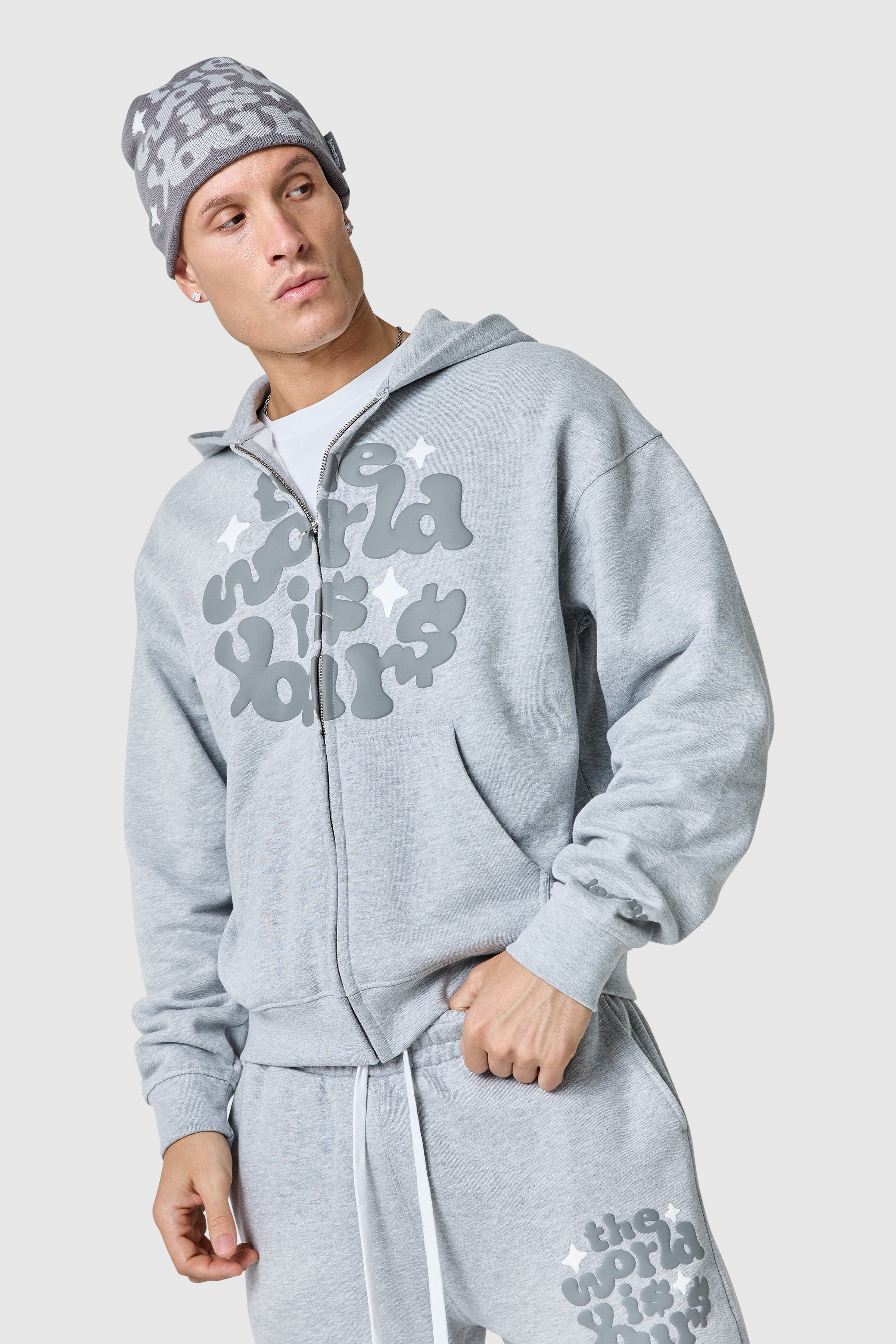Designed with a relaxed, drop-shoulder fit, the World Is Yours FZ Hood 2.0 offers ultimate comfort with a cotton and polyester blend. Featuring a bold puff print and ribbed cuffs and hem, it pairs perfectly with the matching fleece jogger for a complete look.