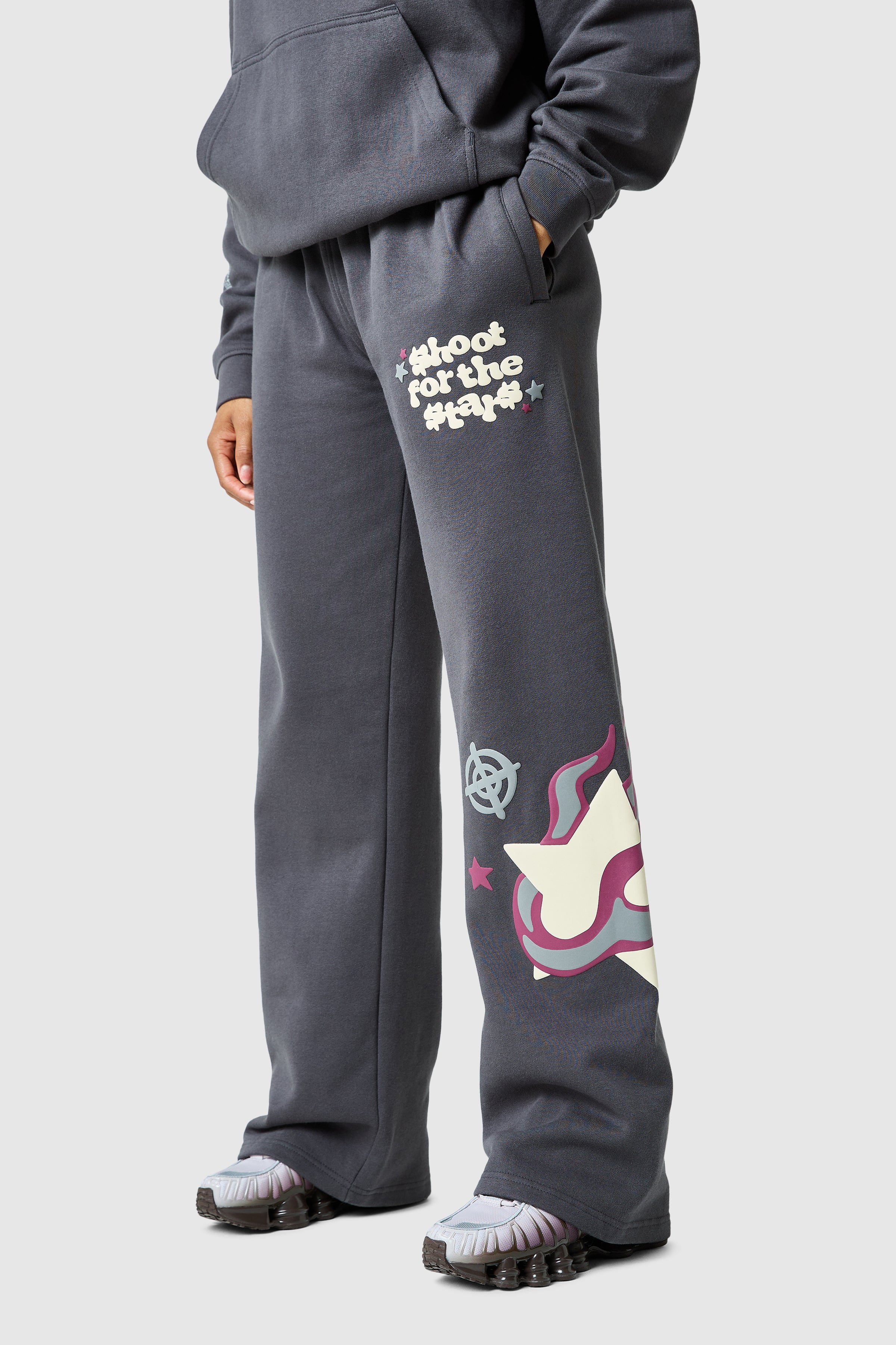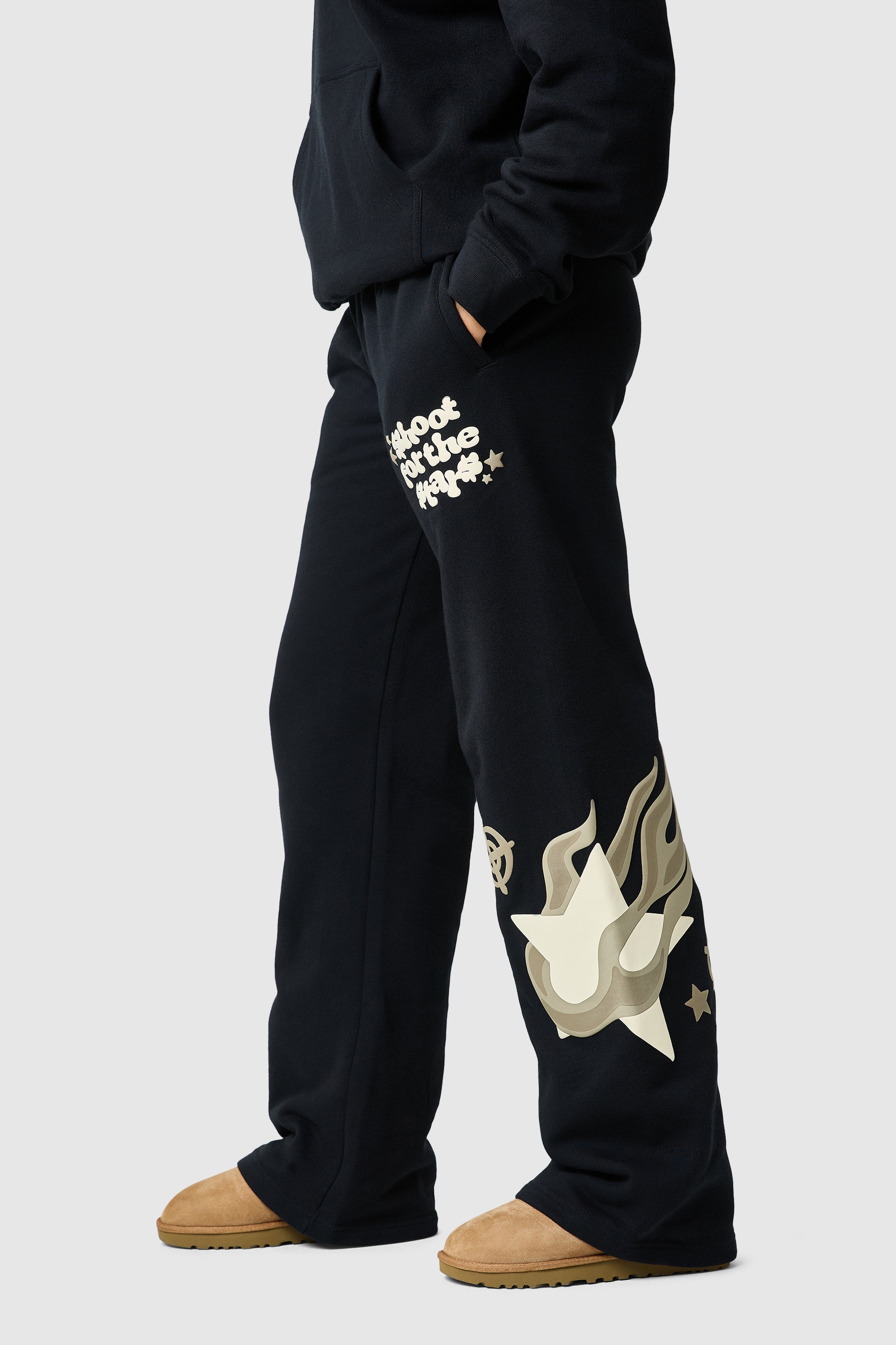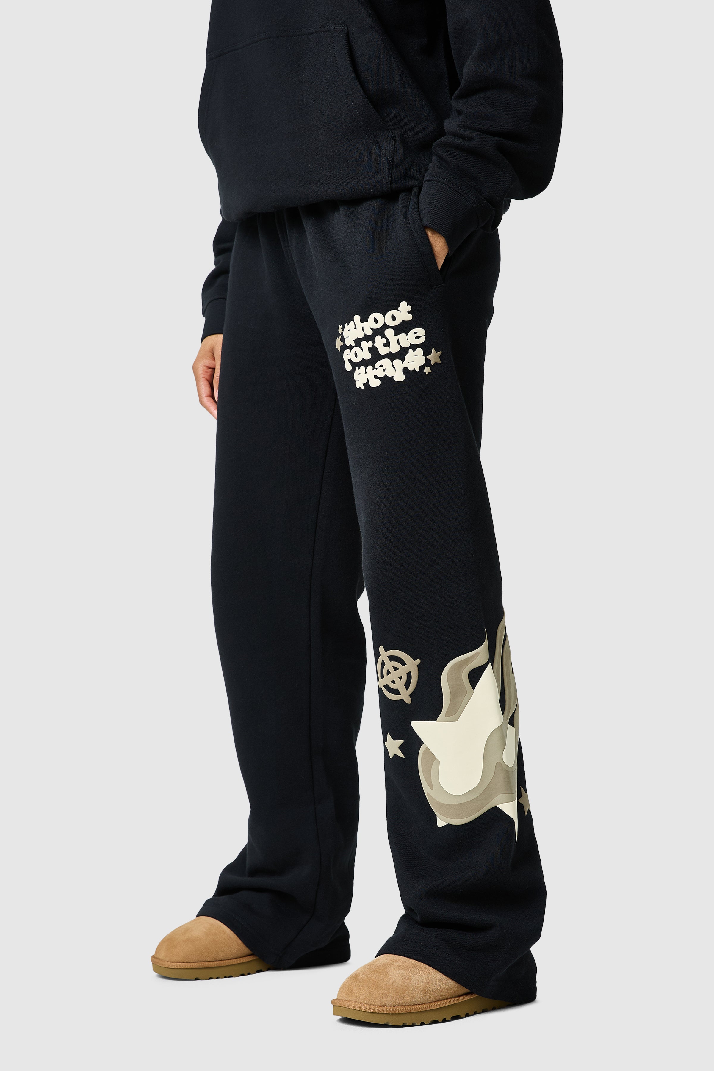 The Shoot For The Stars Jogger features a loose, flared fit with a bold graphic puff print, blending comfort and style effortlessly. Pair with the matching hood for a relaxed, complete look.